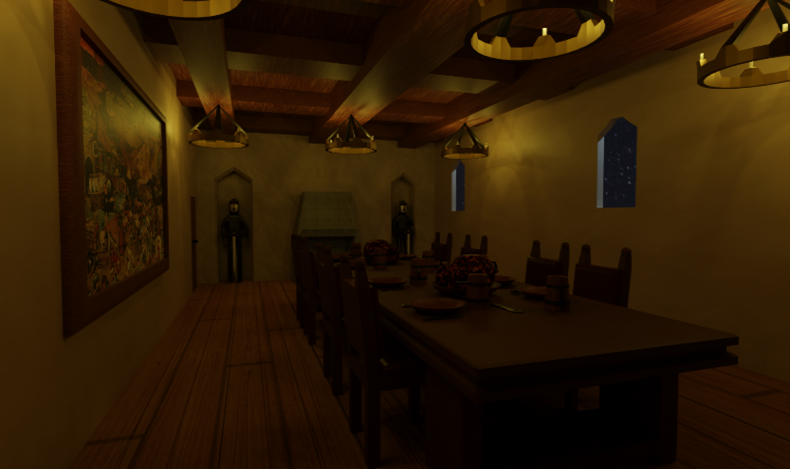 Il s'agit d'un projet Blender réalisé dans le cadre d'un cours de modélisation 3D. L’objectif était de créer une salle à manger avec des meubles et de la nourriture. J'ai donc choisi de partir sur un style médiéval afin de ne pas rester dans un style moderne et ainsi apporter un peu de variété à l’ensemble des projets. Il convient également de mentionner que c'était ma première expérience avec un outil de modélisation 3D.